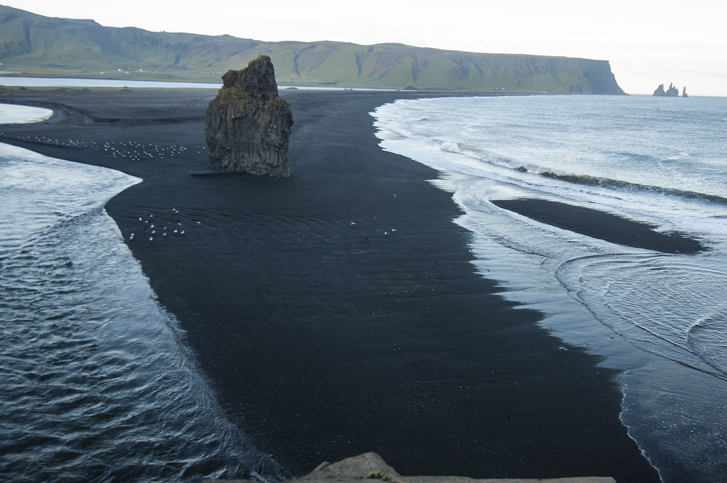 Je ne sais pas si vous saviez mais nous on a su qu’il fallait savoir que… Il y a un rocher percé en Islande. À Dyrhòlaey. D’après moi, il y en a plus qu’un mais bon, celui-ci fallait aller le voir. Sauf qu’avant, comme il est près de 19h30, on doit aller à Vík faire le plein de nourriture avant que les magasins ferment. Car on va rejoindre notre camping, avec bbq, beaucoup plus tard. C’est donc sous un splendide «coucher de soleil» que nous faisons la route jusqu’à Vìk. Après l’épicerie, on retourne à Dyrhòlaey voir le rocher percé et autres merveilles du paysage.