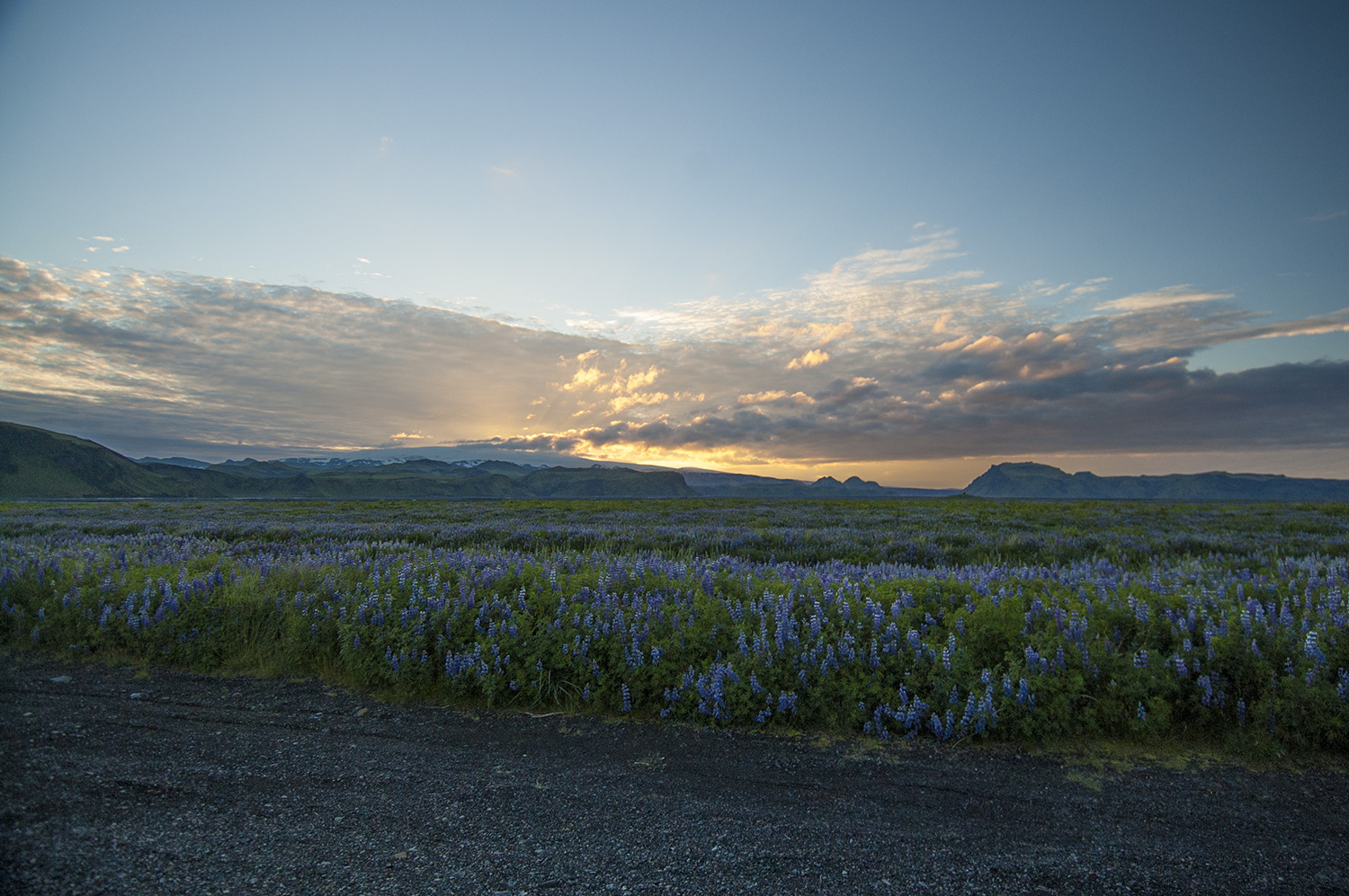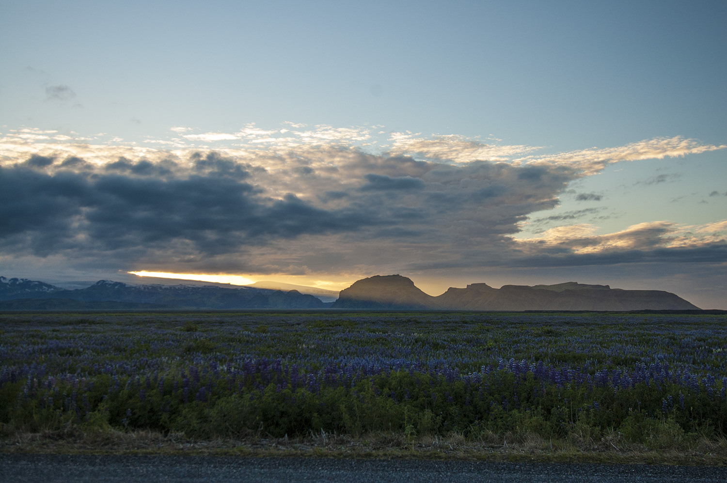 Il est maintenant 22h, nous devons trouver notre camping pour la nuit. PM a spotté sur un blog, un spot complètement fou. Pakgil. Sauf que sur la carte, on ne comprend pas trop comment s’y rendre (on saura pourquoi plus tard). On file donc sur la route 1, se demandant si on ne passait pas tout droit. On surveille le nom des rues. On en voit une qui ressemble à ce qu’on a trouvé sur Google map, mais ce n’est pas exactement ça, donc on continue. Il est rendu 11h30, on roule sur un long bout plat, bordé de lupin lilas et ce superbe coucher de soleil sur les montagnes et l’immense glacier en arrière plan. C’est bien beau, mais on est pas dans la bonne direction certain… C’était pas aussi loin.