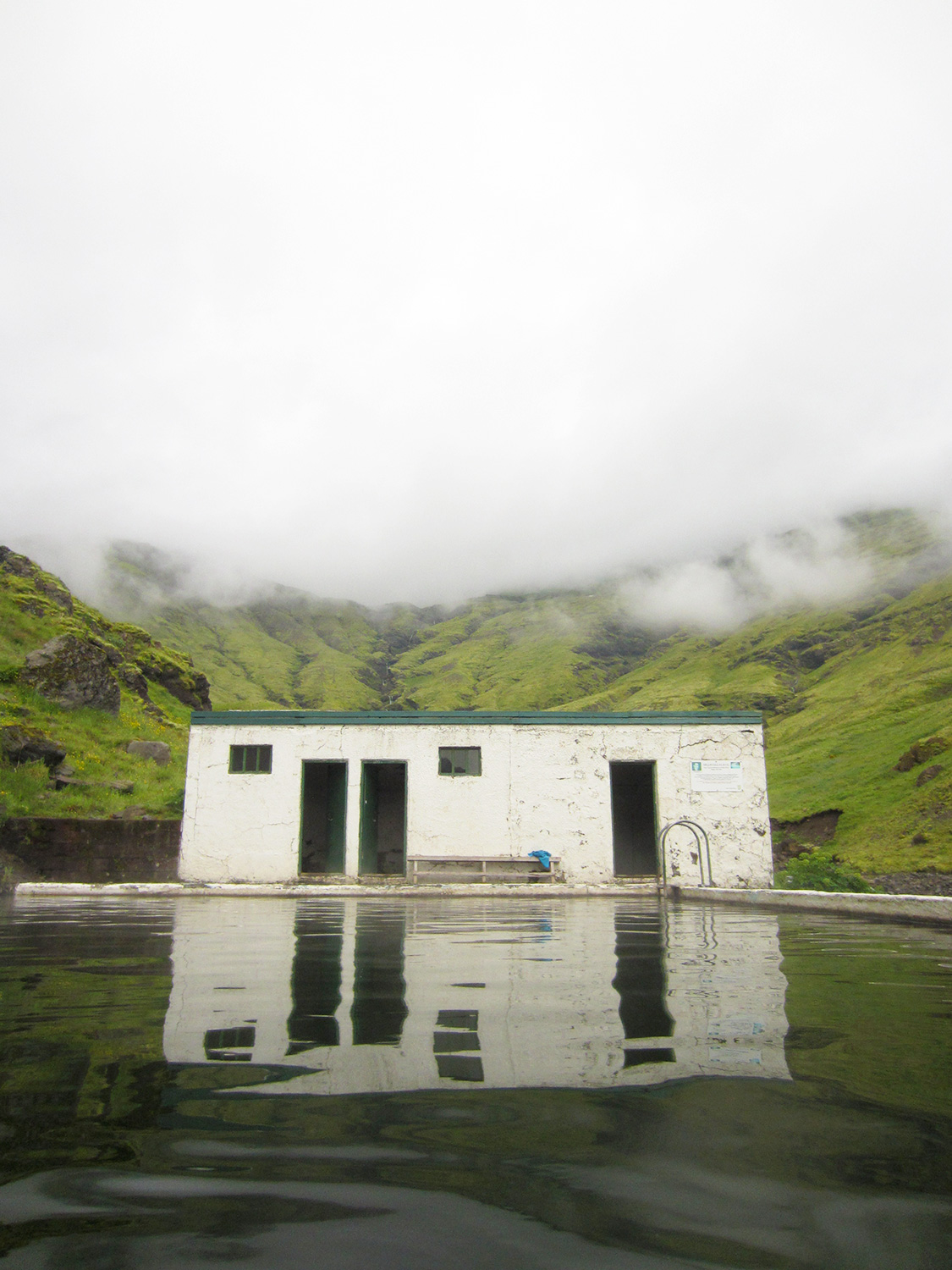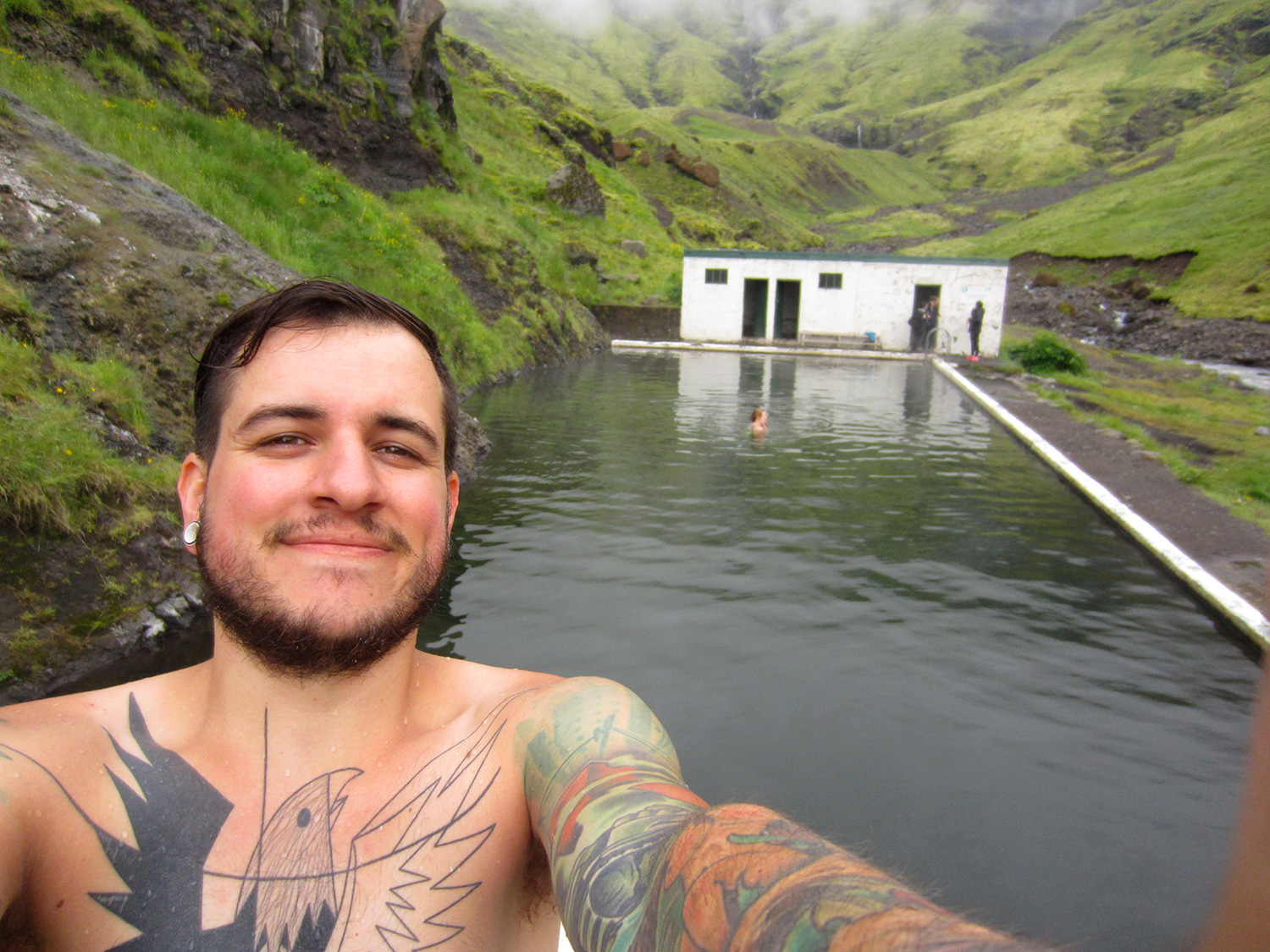 Il est maintenant près de 12h30, le soleil semble vouloir se pointer le bout du nez, on est content! On roule en direction de «LA» piscine : Seljayallalang pool à Serjavellir. Pour y arriver, il faut y croire! On a vu une petite famille rebrousser chemin croyant que ce n’était pas par là! Après avoir pris un petit chemin de gravel, on a du se garer et marcher un bon 10-15 minutes pour se rendre enfin à la piscine. Wow! Bon, je connais beaucoup de gens qui n’aurait pas tenté de s’y saucer le gros orteil, mais je vous jure, la baignade valait le coup. C’était… Encore là, je cherche mes mots. On a eu la chance d’être pratiquement seuls un bon bout de temps pour profiter de la tranquillité et de la magie des lieux. Avouez que vous pensez croche hein!!! Gang de pervers! 😉