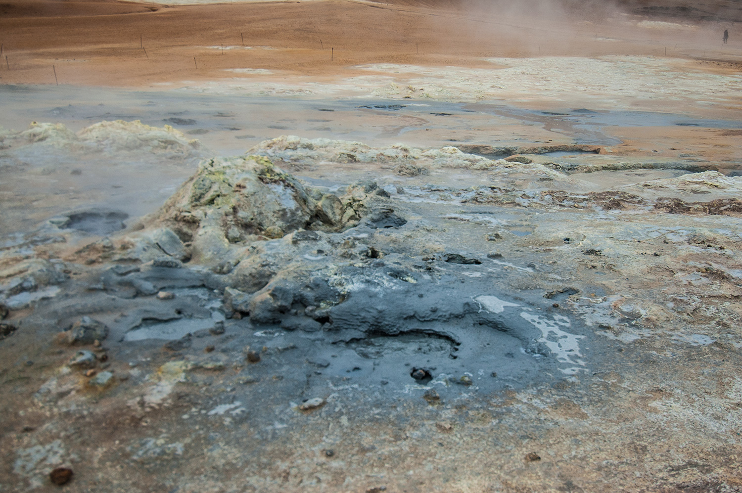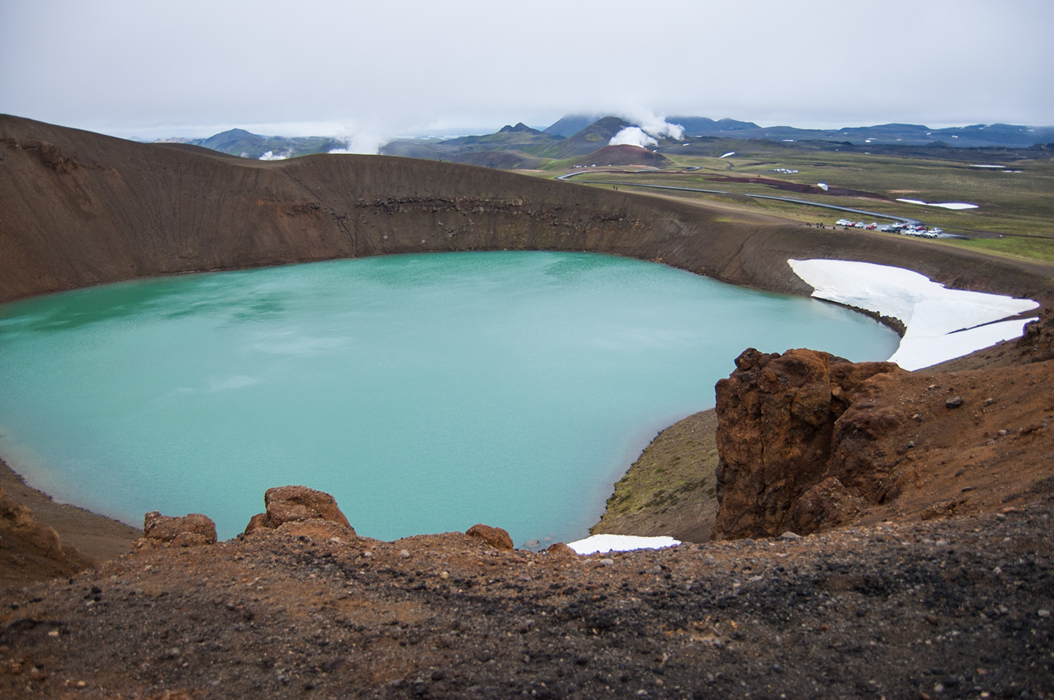 Krafla. Le volcan qui n’a pas l’air d’un volcan. Le plus actif de la région. Tranquille. Il fait supposément +9 dehors mais avec le vent de 50 km\h, il doit ben faut -5! (J’approximatise mais il faisait vraiment pas chaud). Bref, la température parfaite pour monter sur le top d’un volcan. En prime, de la belle bouette partout. Malgré tout, l’ascension en valait la peine. Le lac turquoise dans le creux des montagnes créait tout un contraste avec l’orangé des montagnes. En plus des bandes de neige autour. De toute beauté. On pouvait aussi apercevoir (et sentir) quelques solfatares au loin et la centrale géothermique tout en haut.