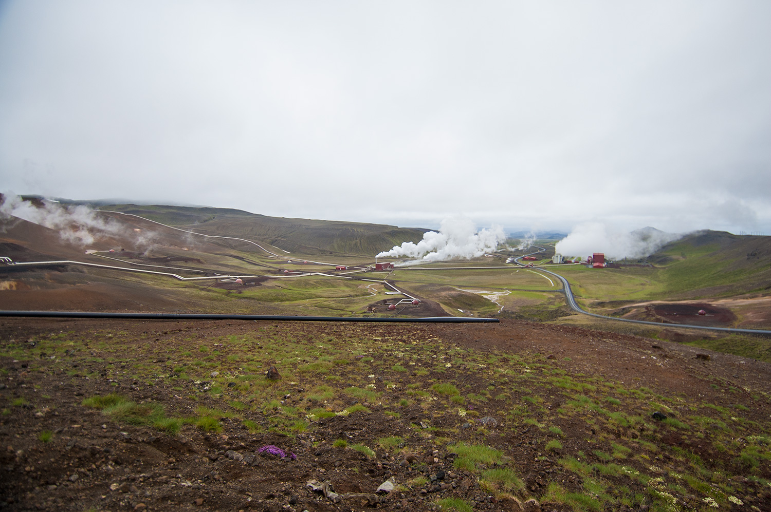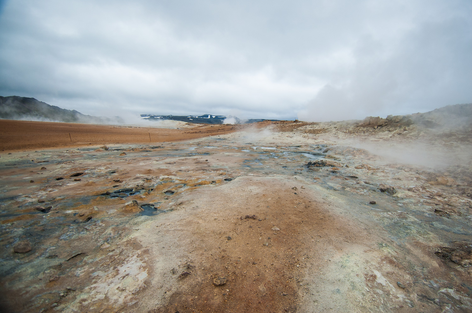 On a redescendu les montagnes qu’on avait monté pour se rendre au volcan en s’arrêtant à chaque spot possible. Le clash était spectaculaire entre le brun et le vert des montagnes, le orange des solfatares, le rouge de certaines autres montages, le turquoise-blanc d’un bassin géothermal avec des montées de vapeur ici et là.
