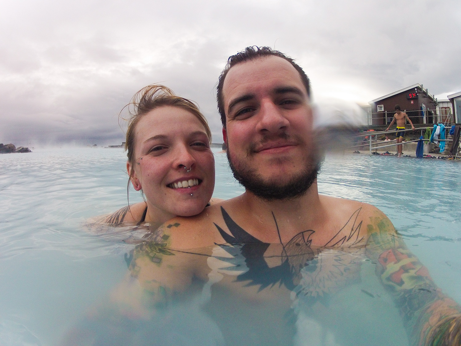Je repasse donc par les douches publiques… (Merci, il y a deux douches privées!) Comme je vous disais, le vent est assez atroce et il fait maintenant 8.8C. La petite course entre le vestiaire et l’eau est d’un désagréable assez crissant! Surtout que l’eau n’est pas si chaude que je l’avais imaginé. Il a fallu explorer pour trouver les spots plus chaud. On en a trouvé… Là où tout le monde se tenait. Fais que notre petit moment de détente ne l’a pas vraiment été. On s’est rattrapé dans le hottub (enfin vide) et le sauna pour avoir chaud et relaxer un peu.