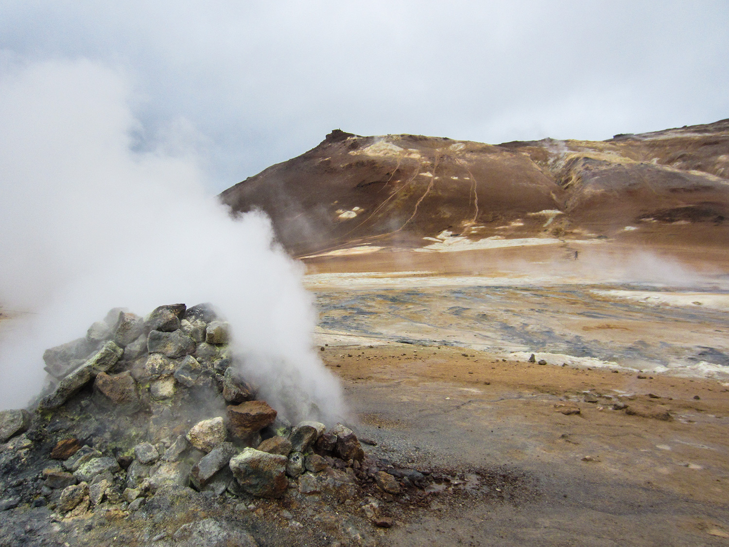 Sur le chemin, on s’arrête à Hverir. Un autre site de solfatares. L’un des plus vaste au pays. Comme on était brûlé de notre début de journée, on s’est parcké en avant et on s’est bu une petite bière tranquille dans l’auto. On a ensuite été se promener rapidement sur le site. Ça sent tellement fort et ce n’est pas trop bon à respirer. C’était quand même très cool de les voir en action comme ça!
