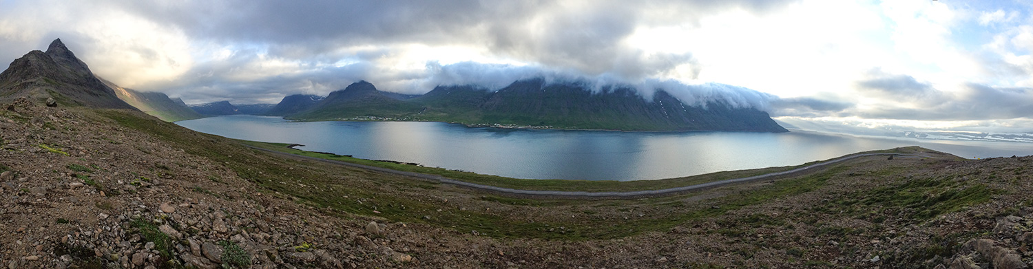 C’est vers 14h que nous partons de Djúpavík vers Ísafjörður avec la joie d’avoir le soleil avec nous presque tout le long. On capote! On peut enfin profiter de toute la vue sur des paysages magnifiques. Parfois, on monte haut en montagne et l’on tombe dans la neige et le froid et 5 minutes plus tard, on revient au niveau de la mer sous les rayons chauds du soleil. On fait donc plusieurs arrêts en chemin pour prendre des photos.
