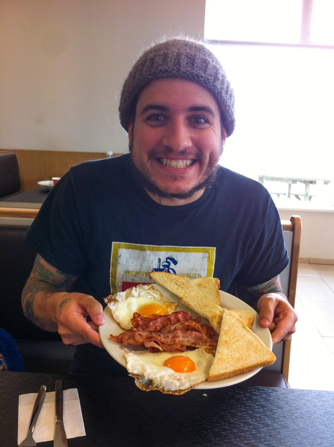 Retour à Borgarnes, au Quiznos. Ben oui, on l’aime de même (non!). En fait, c’est qu’il y a un deuxième restaurant dans cette « station-service-toilette-bar-dépanneur-cinéma-… » Et il serve des oeufs et du bacon. PM est fou comme de la marde. Bon, c’était assez ordinaire et plutôt froid, mais comme on dit (trop souvent depuis le début du voyage) « ça fait la job ».